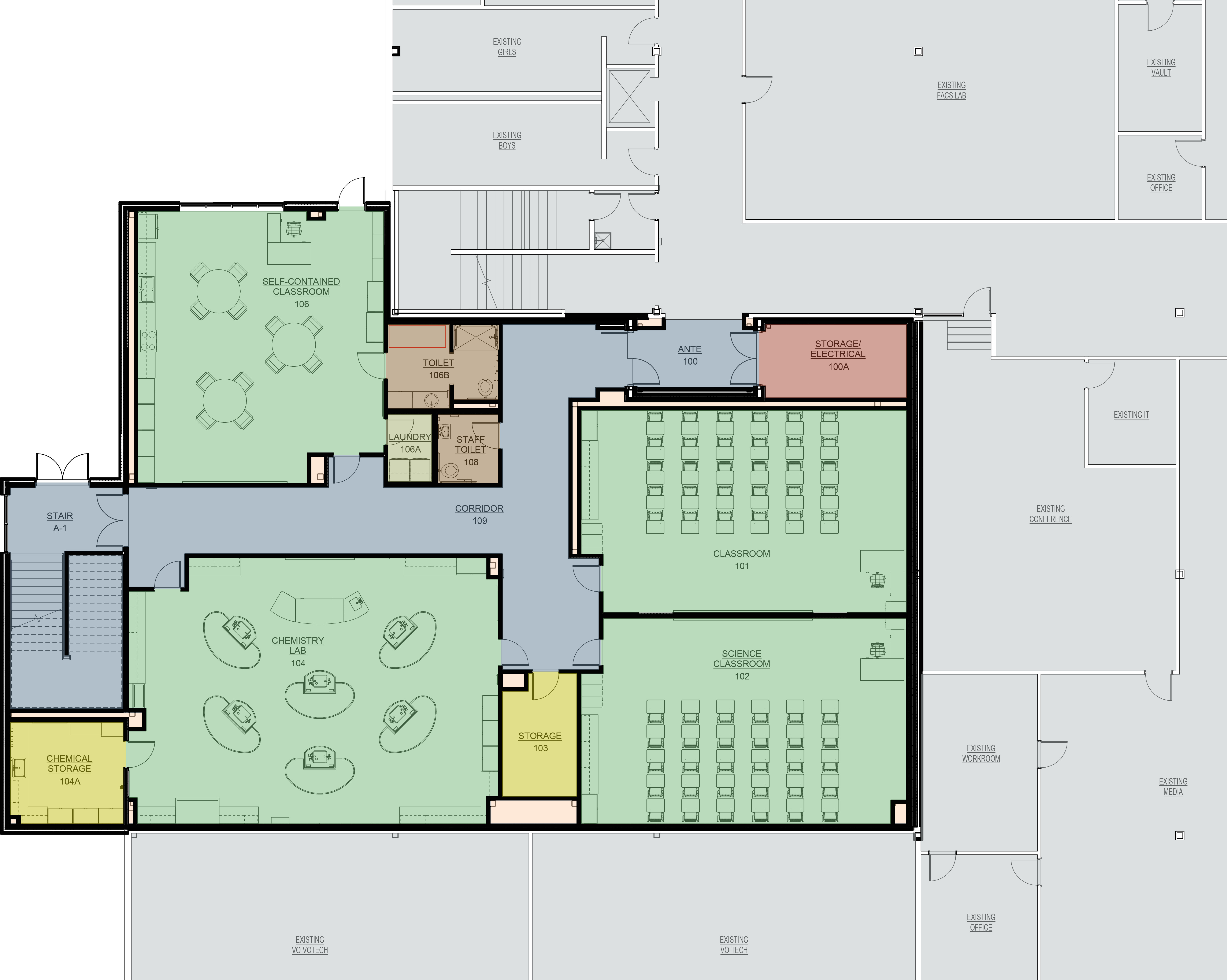 The addition includes science lab areas and adjacent classrooms, as well as, self-contained classroom space and support space and chemical storage. "Two part" (shaft) fire walls were used on the project to allow for a seamless connection between the new and existing spaces while allowing for maximum safety to the students and staff per life safety requirements.
