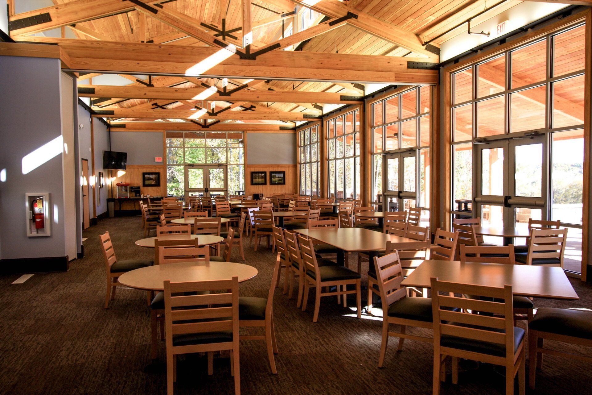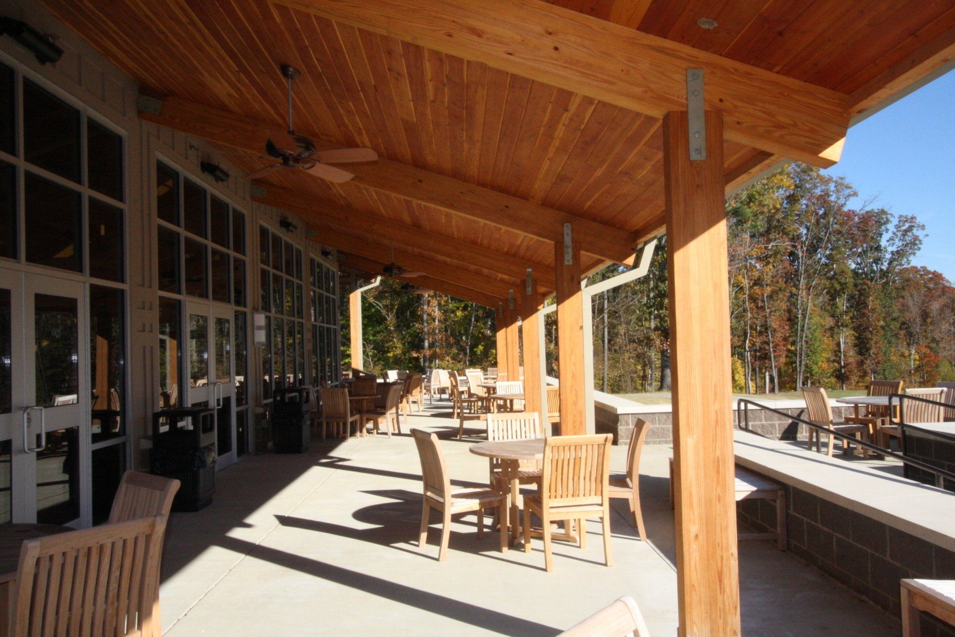 A 27-hole Andy Dye signature golf course acts as a backdrop for this low slung wood and masonry clubhouse structure. Exposed rafters and board-and-batten exterior finish give a natural feel while maintaining durability for this isolated building.